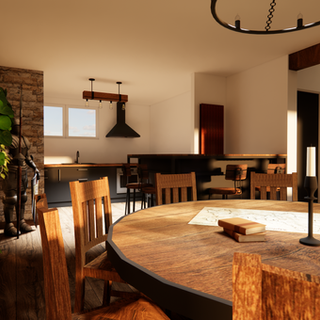 Pour délimiter l’espace de façon fonctionnelle sans le cloisonner, un bar a été imaginé sur mesure, alliant bois vieilli et métal noir. Ce comptoir vient structurer la pièce tout en renforçant l’ambiance "taverne" avec ses tabourets hauts au design rustique.